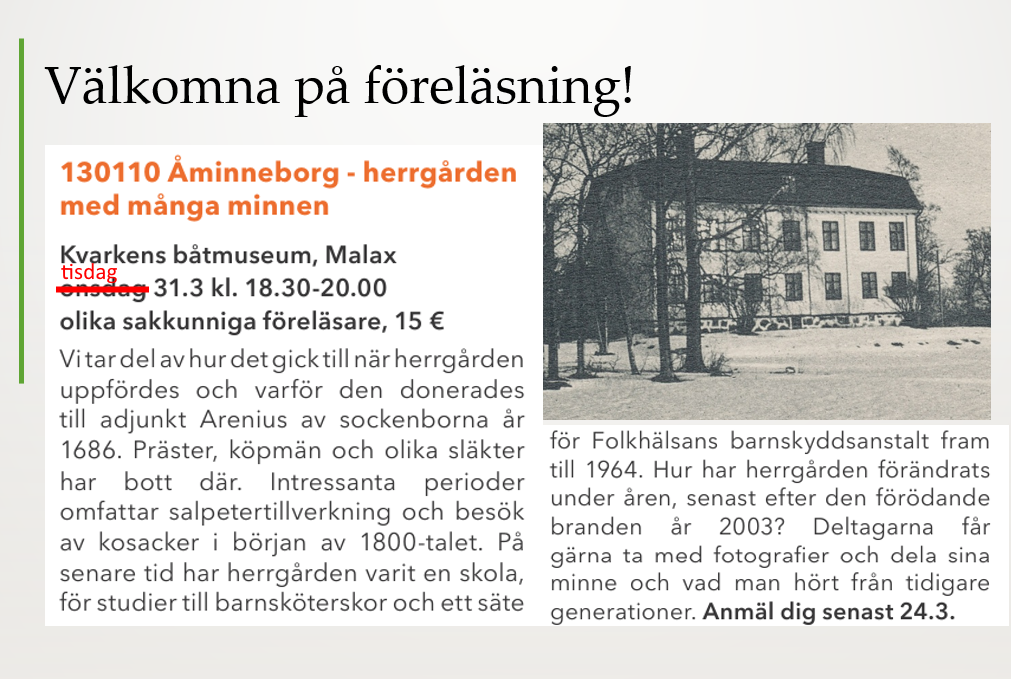 Verksamhetsberättelsen för Malax museiförening och Kvarkens båtmuseum för 2024 kan ses på länken här. Vällingklockan för december 2025 har utkommit och finns direkt på länken här. Även äldre årgångar finns på länken Vällingklockan på denna sidan. Nytt dokument ur vårt arkiv. Gamla ortsnamn i Yttermalax och i Övermalax samt i Malax skärgård. Samlade av Siri Hagback. Här finns landhöjningskartor om hur Malax området stigit ur havet och var befolkningen bosatt sig och namngivit vägar och platser. Uppgifterna är mångsidiga och ger en bild av utvecklingen från sjö till land under århundradenas lopp. Många kartor och fotografier att studera och komma ihåg från den gamla tiden. Se bilagan här! Nytt dokument ur vårt arkiv: Viasgränden omkring 1915 Reklamfilm om Kvarkens båtmuseum finns på länken här Livet på en järnåldersgård på 600-talet. Nytt dokument finns under Forntiden i Malax. Brinkens museums bibliotek: Boklistan kan du se här! Skären — ett museum på nätet se mer på länken här https://skarenmuseum.fi På denna länk finns nu även Sjöfartstema uppdaterat. Två nya dokument finns nu inlagda under ”Forntiden i Malax” Du hittar dem under länkarna här Sägner i Malax del1 och 2 och Glimtar ur skolans historia Årens månadsbilder för Brinkens museum och Kvarkens båtmuseum finns på länkarna på denna sidan. Här finns detaljerad information om bl. a händelser och objekt som finns i museernas samlingar.